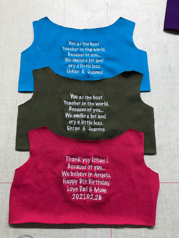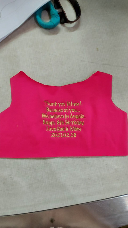 從美國購買了超可愛的小泰迪熊100多隻,活動的關係想把小熊身上的衣服做一點改變。希望把小熊的衣服,同比例放大,且在衣服前側與後側客製刺繡圖案與文字。這隻熊是不是很可愛,但當下收到熊的時候只有很抖,因為知道這個真的很不好做。
