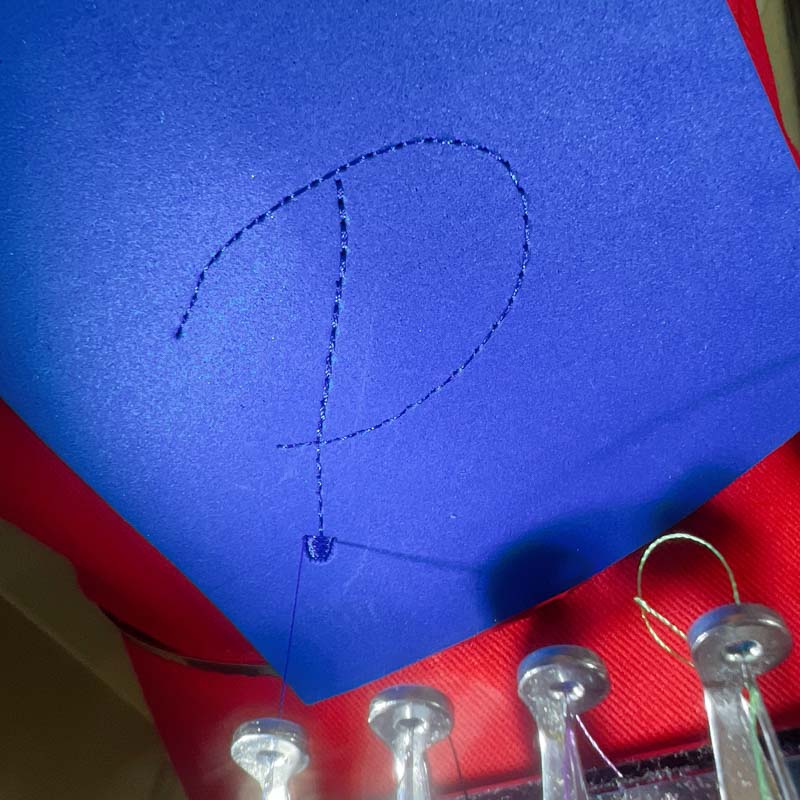 因為在打版與製作上真的比較複雜啊!外框線是平繡的方式,中間的文字是立體。當在電腦端打版時依靠經驗去抓取縮率外,還要考慮針跡走的方式可能會影響後面製作上的位移,所以在打版時要先做修正。