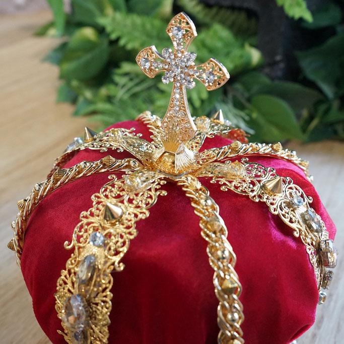 VK首選第一名就是這一個國王皇冠了,只能說太用心還特地選用了紅色呢絨布縫製。儼然活生生中古世紀國王戴的皇室皇冠啊!歐洲皇室確實很常用鑽石珠寶來裝飾,睜大眼睛瞧瞧這樣的設計的確能讓你一秒變國王。